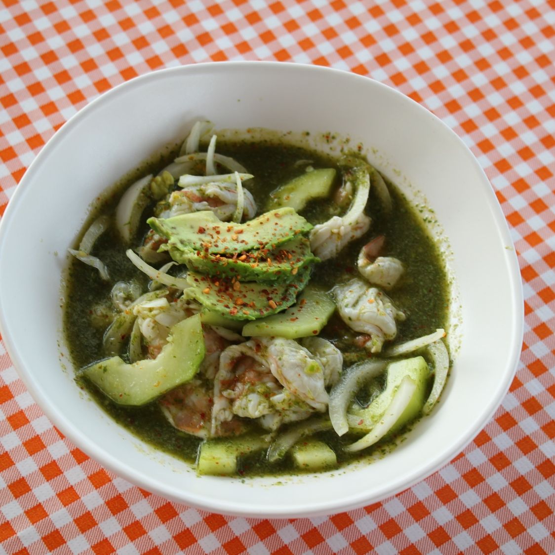 exquisita combinacion de camaron, pulpo, surimi, caracol, pescado, aguacate y cebolla