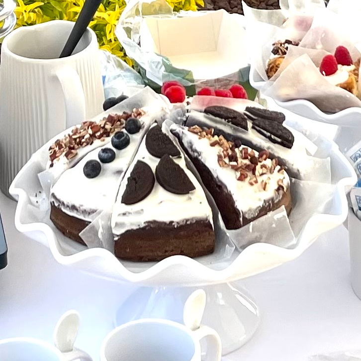 Delicioso Pastel de Chocolate horneado al nivel del mar relleno de chispas de nuez y copeteado con fruta.