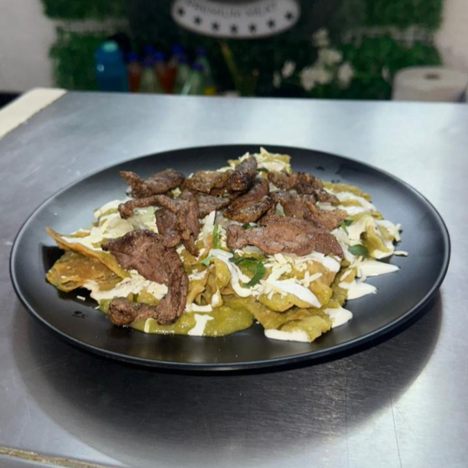 Chilaquiles bañados en rica salsa verde acompañados de proteina de eleccion