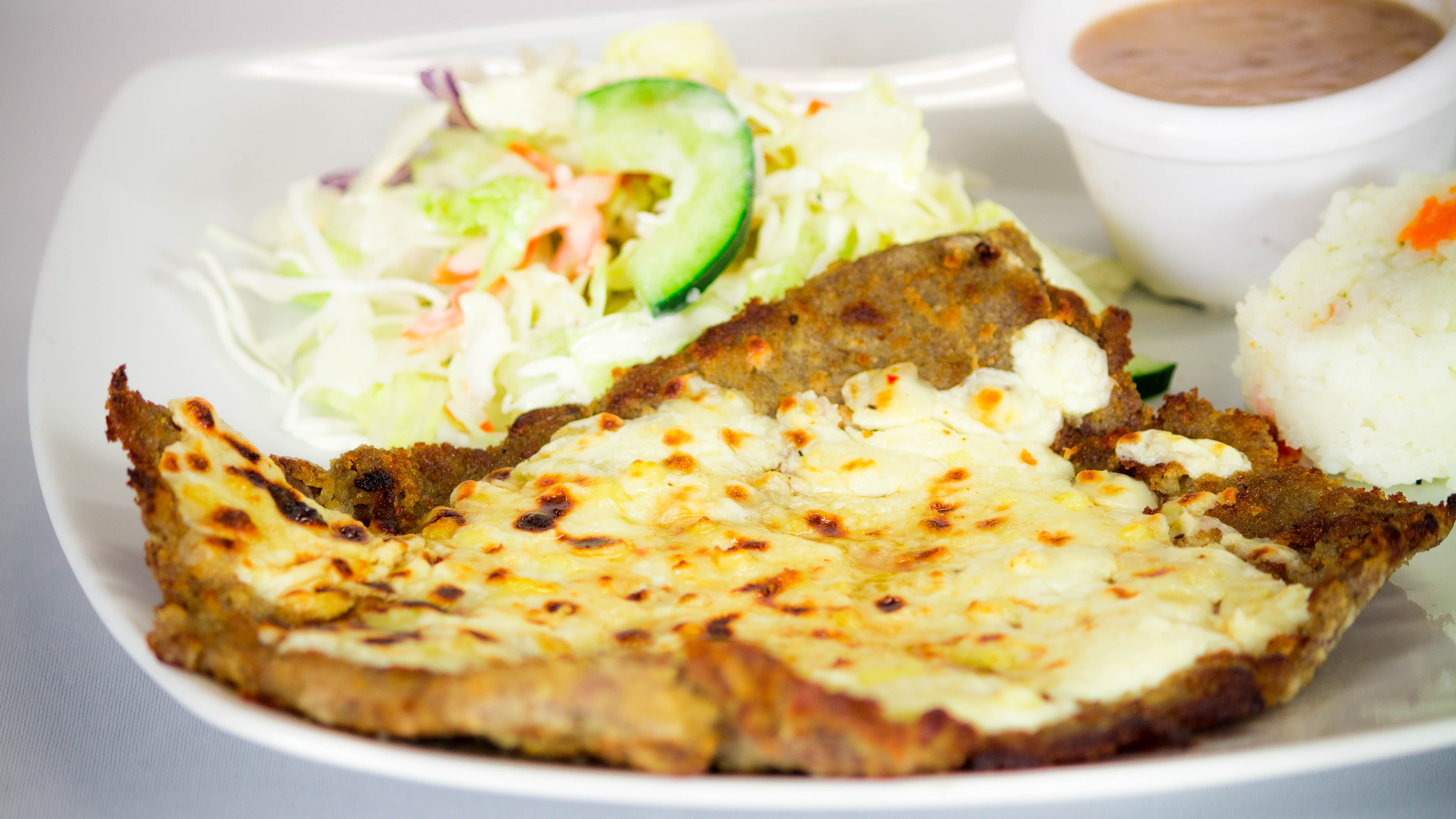 Exquisita milanesa de res gratinada, acompañado con chiles toreados, mezcla de ensalada.