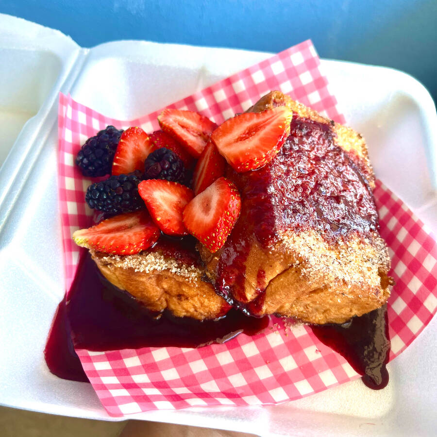 Dos rebanadas de pan ligeramente tostadas y bañadas en la mezcla especial de la casa, doradas a la perfección y servidas con un toque de azúcar, maple, fruta y compota de frutos rojos.