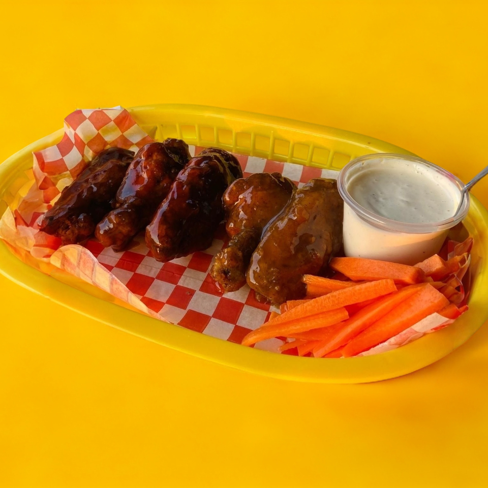 Deliciosas alitas fritas bañadas con salsa, acompañadas de aderezo ranch casero y bastones de zanahoria