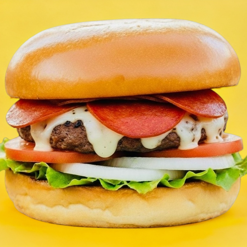 Carne 100% de res, queso americano, queso manchego, pepperoni, pan brioche, lechuga, jitomate y cebolla.