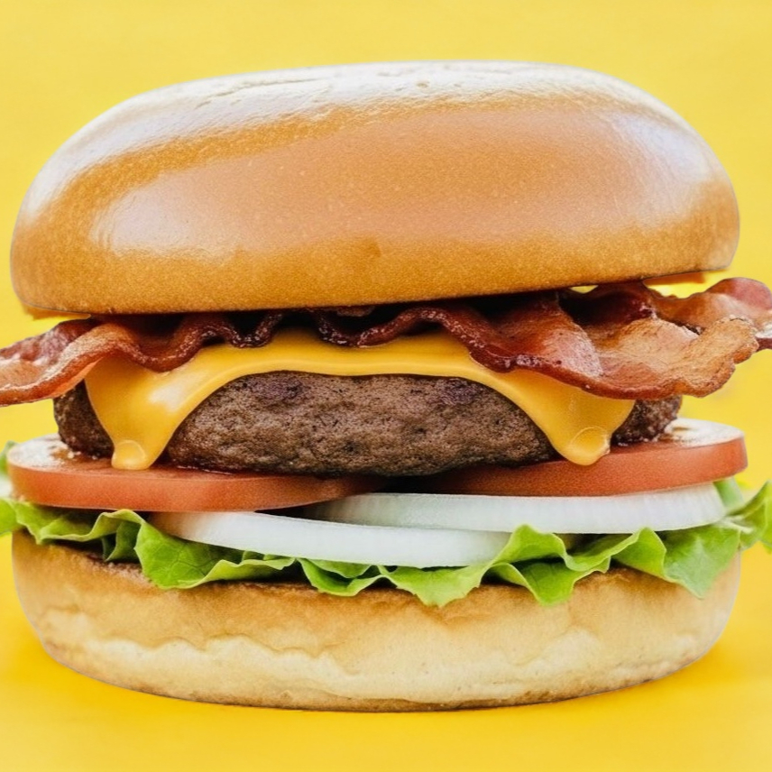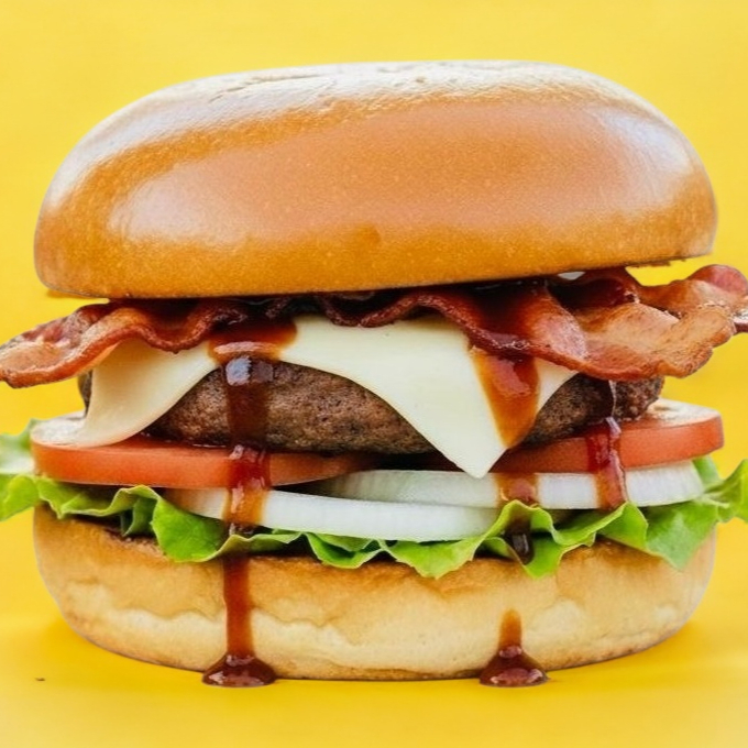 Carne 100% de res, queso americano, tocino, salsa BBQ, pan brioche, lechuga, jitomate y cebolla.