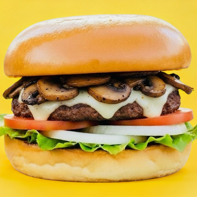 Carne 100% de res, queso americano, queso manchego, champiñones, pan brioche, lechuga, jitomate y cebolla.