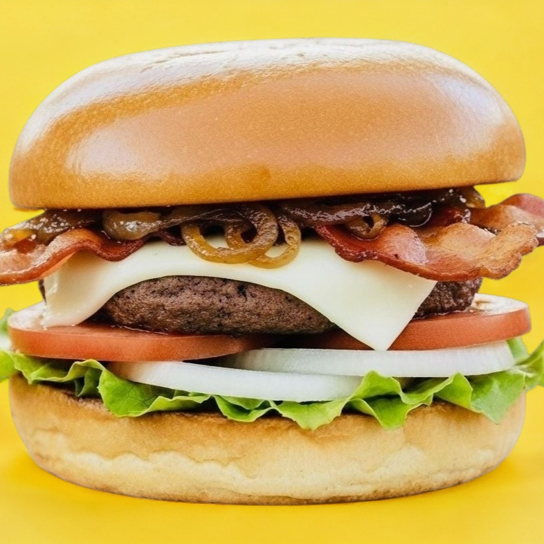 Carne 100% dde res, queso americano, tocino, pan brioche, lechuga, jitomate y cebolla.
