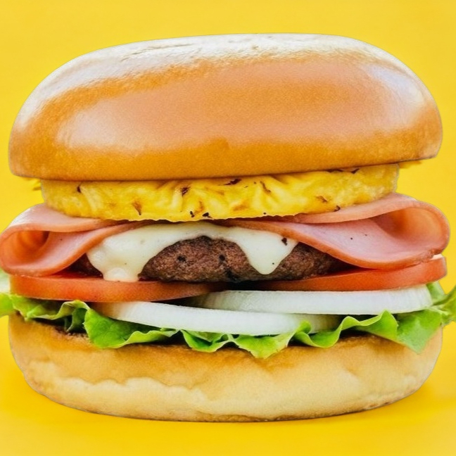 Carne 100% de res, queso manchego, piña, jamón, pan brioche, lechuga, jitomate y cebolla.