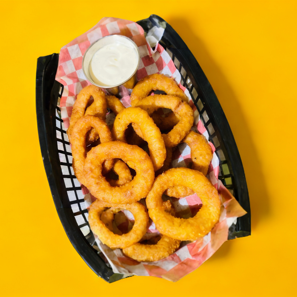 12 piezas de crujientes aros de cebolla, acompañados con nuestro aderezo ranch casero