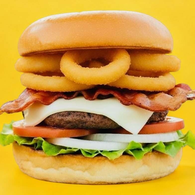 Carne 100% de res, aros de cebolla, queso americano, pan brioche, lechuga, jitomate y cebolla.