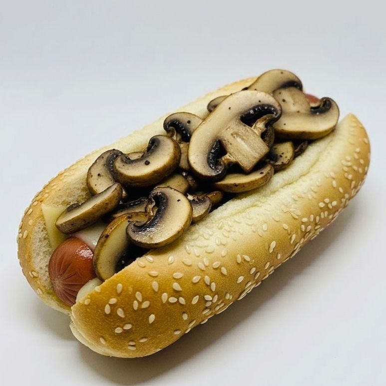 Deliciosa salchicha jumbo con una cama de queso manchego y champiñones