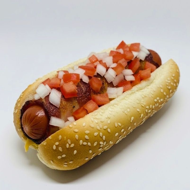 Deliciosa salchicha tamaño jumbo enrollada con tocino, mayonesa, jitomate y cebolla