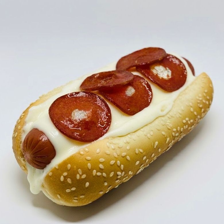Deliciosa salchicha jumbo, con una cama de queso manchego y peperonis con nuestro aderezo de la casa