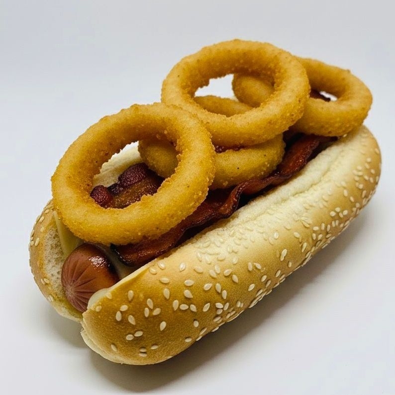Deliciosa salchicha jumbo con una cama de queso manchego tocino y aros de cebolla