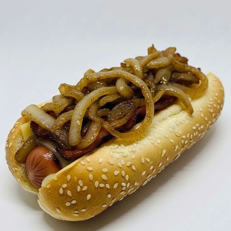 Deliciosa salchicha jumbo con una cama de queso manchego tocino y cebolla caramelizada