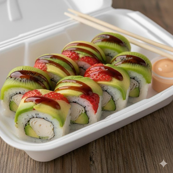 ROLLO DE TAMAÑO NORMAL Rollo frutal Por dentro ,aguacate ,surimi,queso crema ,pepino ,por fuera fruta de la estación ,rayado con salsa Teriyaki, acompañado de soya
