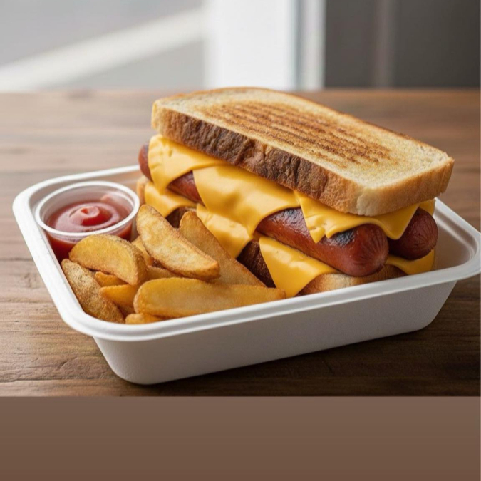 Sandwich de salchicha, con queso amarillo, acompañada de papas, gajo y ketchup
