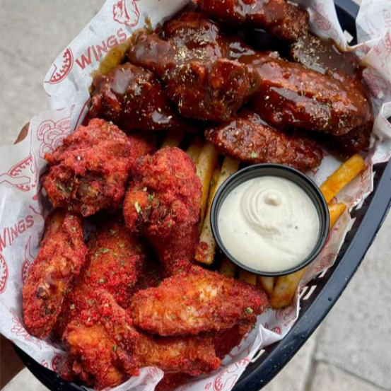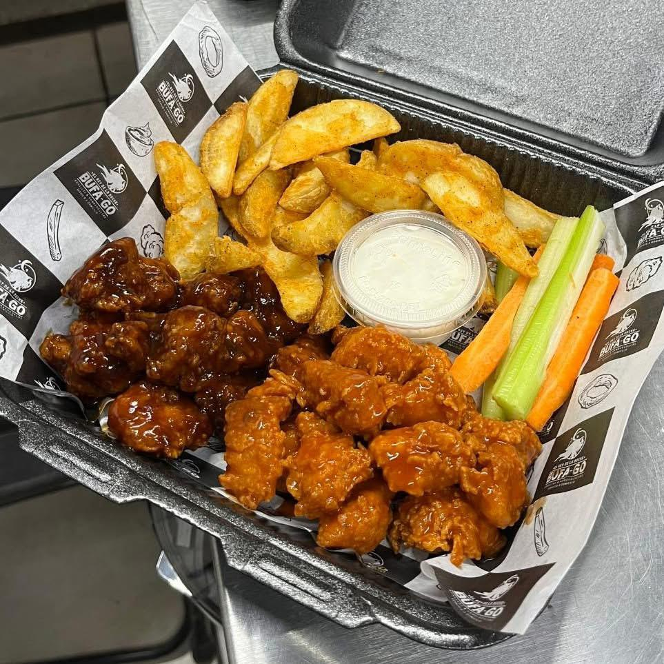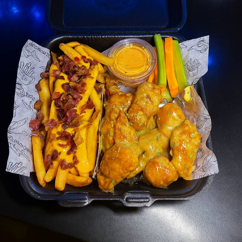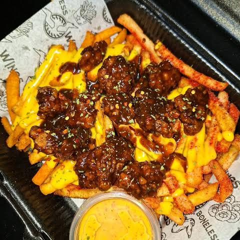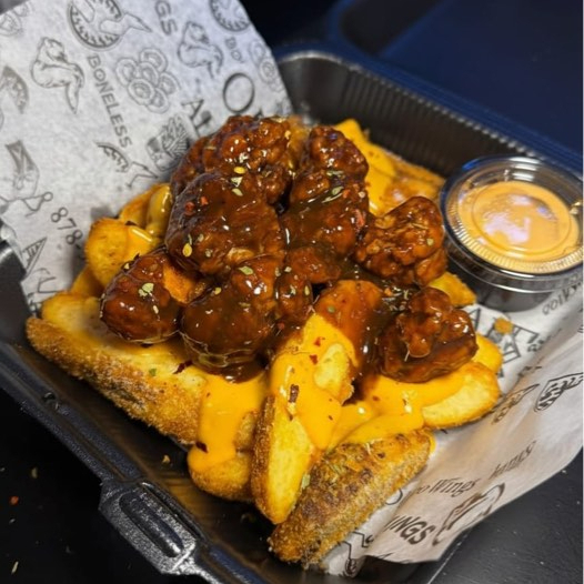 Papas gratinadas en Cheddar, con crocante de tocino y 10 Boneless sabor a elegir acompañado de queso Cheddar y tiras de Verdura entre los sabores, dos máximos mango, habanero, Teriyaki, habanero, negro, miel, mostaza