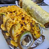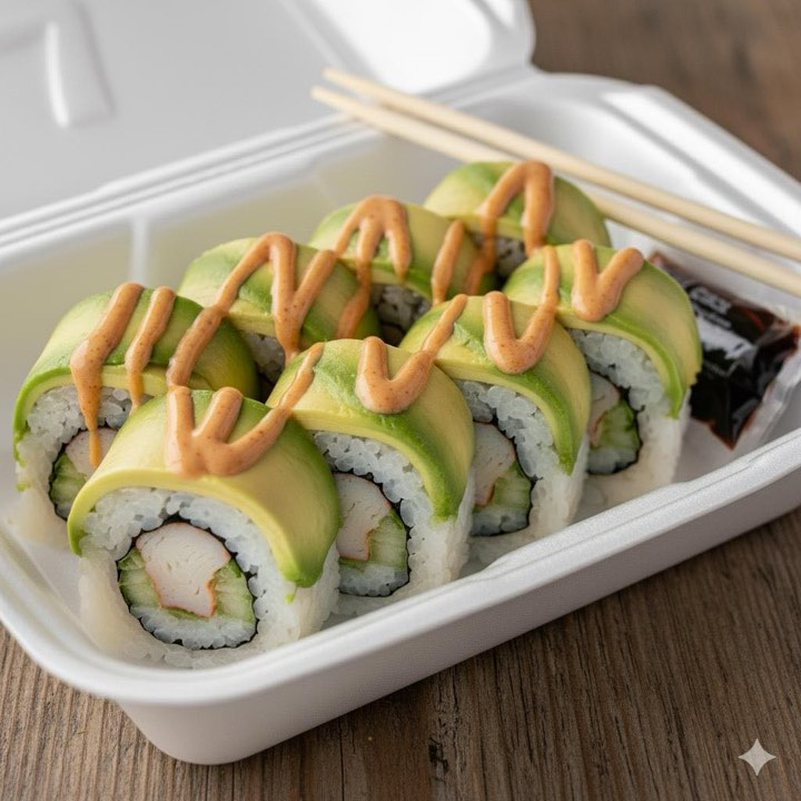 ROLLO DE TAMAÑO NORMAL Avocado roll Por dentro,surimi ,pepino ,queso crema,por fuera láminas de aguacate ,rayado con mayochipotle,acompañado de soya
