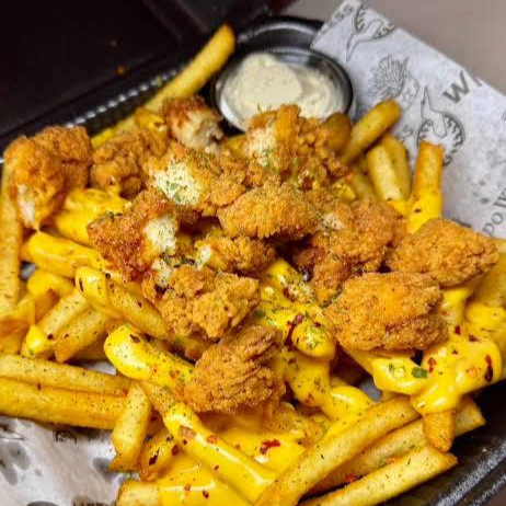 Cama de papas, gajo, bañadas en Cheddar y condimentadas con cinco Boneless sabor a elegir Teriyaki, habanero negro, BBQ miel, mostaza, acompañado con queso Cheddar 1 SABOR A ELEGIR