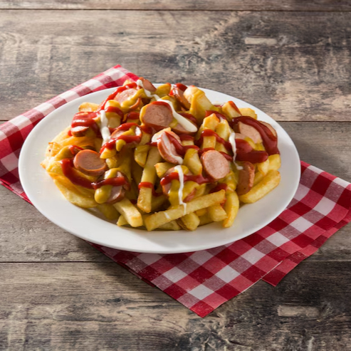 Trocitos de salchicha con papas a la francesa. RAYADO CON QUESO CHEDDAR Y CATSUP