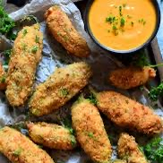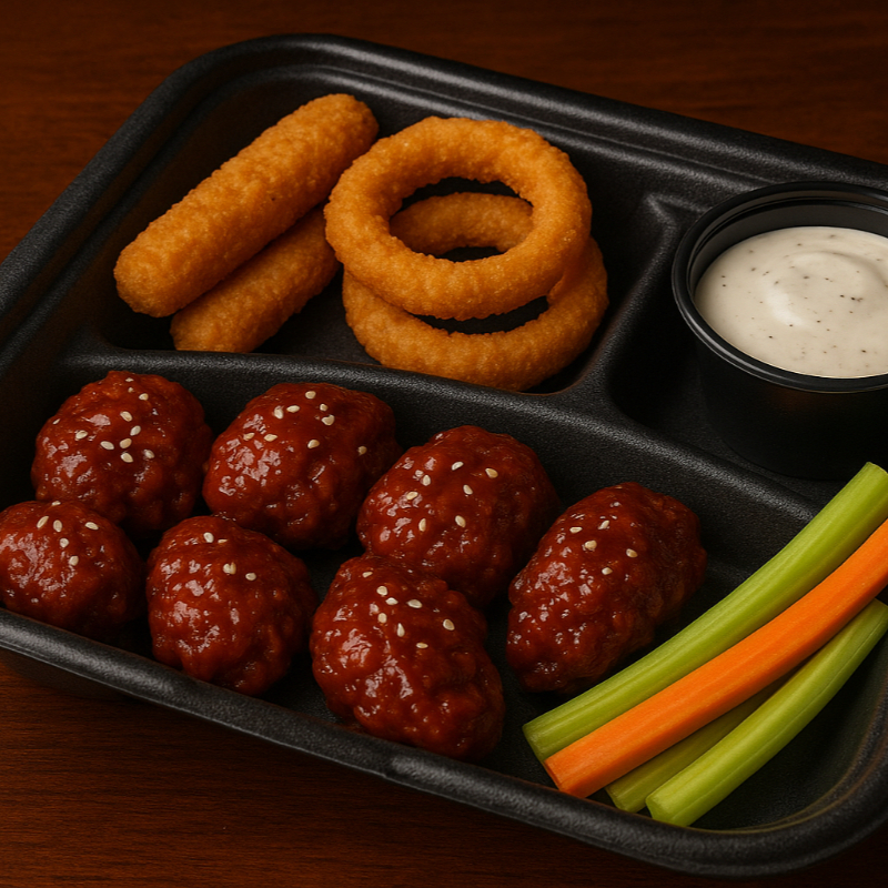 Papa Bacon, con 2 dedos de queso, 2 aros de cebolla, 6 Boneless parmesano o sabor a elegir Teriyaki, habanero negro, BBQ mango, habanero, miel, mostaza, acompañado de Cheddar y tiras de Verdura