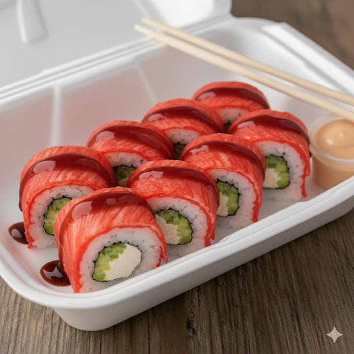 ROLLO DE TAMAÑO NORMAL Surimaki Por dentro surimi ,queso crema ,aguacate ,por fuera láminas de surimi,rayado con salsa de anguila,acompañado de soya