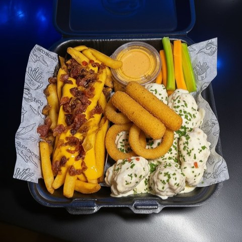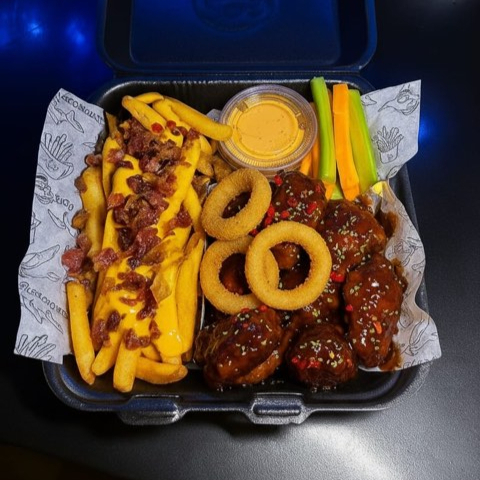 Papas Bacon Cheddar, con 3 aros de cebolla, 5 Boneless BBQ o sabor a elegir Teriyaki, mango, habanero, miel mostaza e incluye tiras de verdura y Cheddar