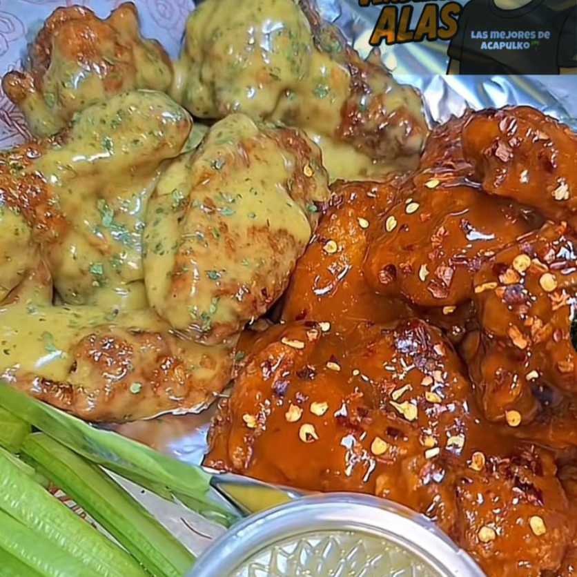 12 ALAS CON ADEREZO Y VERDURAS CON 2 SABORES A LEGIR Cajun Lemon papper Naranja chipotle Habanero negro Teriyaki Mango habanero Bbq