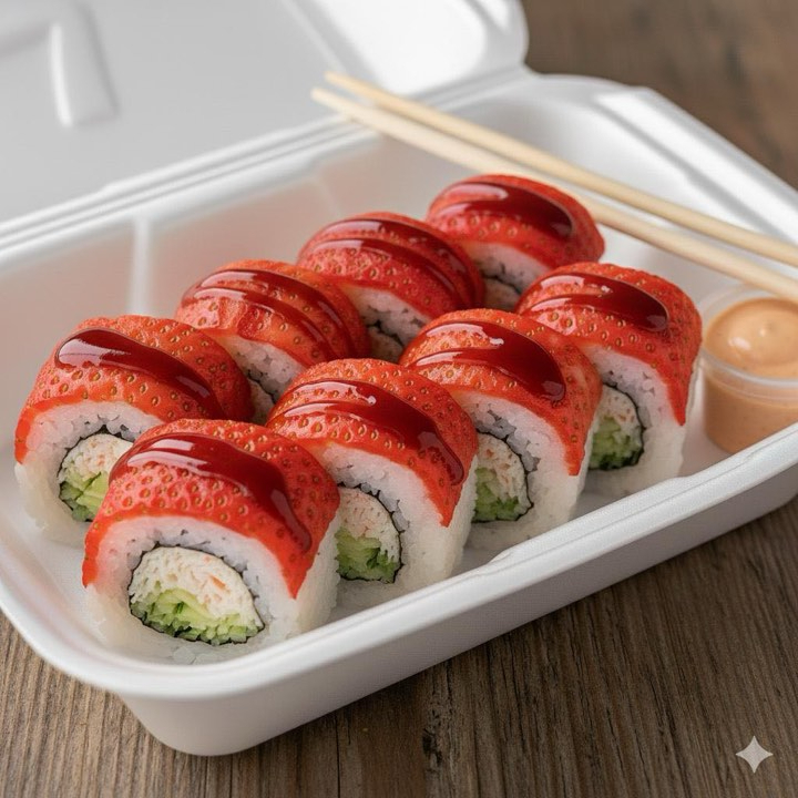 ROLLO DE TAMAÑO NORMAL Fresa roll Por dentro surimi,pepino ,aguacate ,por fuera queso crema y láminas de fresa ,rayado con salsa agridulce , acompañado de soya Publi