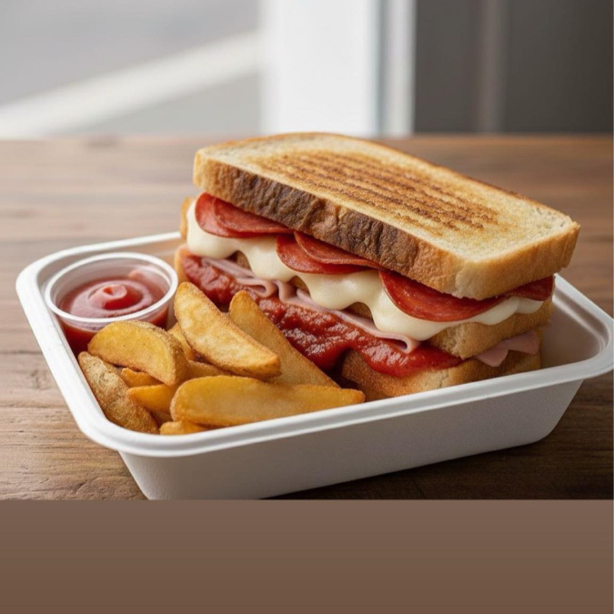 Sandwich de peperoni, jamón salsa, Pomodoro y queso mozzarella, acompañado de papas, gajo y catsup