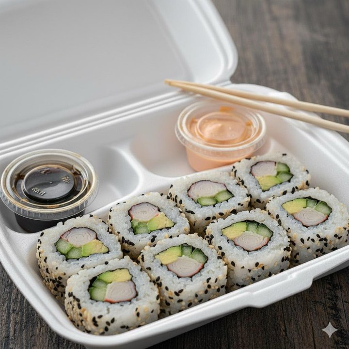 ROLLO DE TAMAÑO NORMAL California kani Por fuera mix de ajonjolí ,por dentro aguacate ,surimi ,pepino queso crema,acompañado de soya y mayochipotle Publi