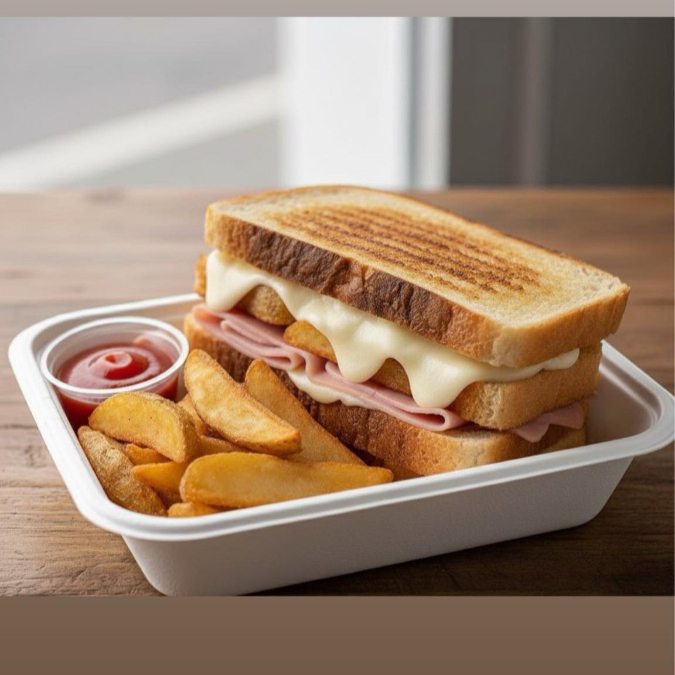 Sandwich de jamón y queso mozzarella, acompañada de papas, gajo y catsup