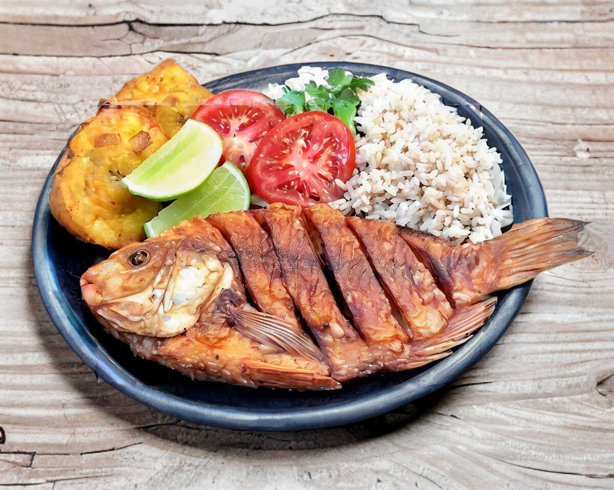 Mojarra frita al ajillo, complementada con ensalada de lechuga, jitomate y aguacate, con arroz, frijoles guisados, salsa picante y tortillas.