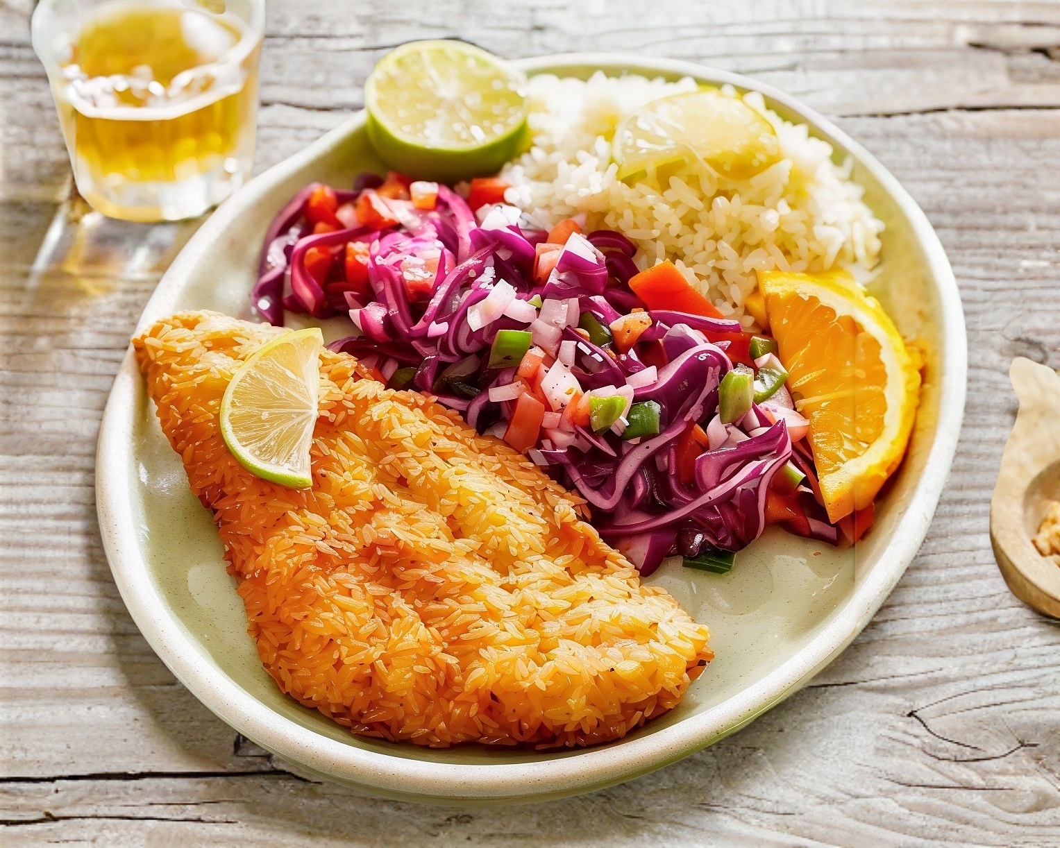 Filete de pez vela empanizado acompañado de ensalada de lechuga, jitomate y aguacate, complementado con arroz, frijoles guisados, salsa picante y tortillas.