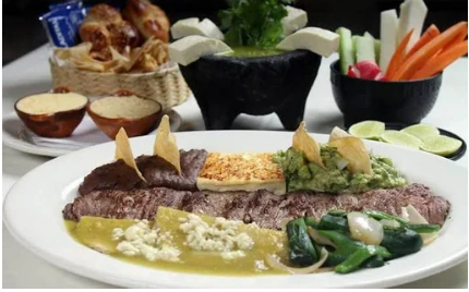 Carne de res asada, acompañada de 2 enchiladas verdes, guacamole, frijoles refritos y totopos, incluye salsa de la casa y tortillas.