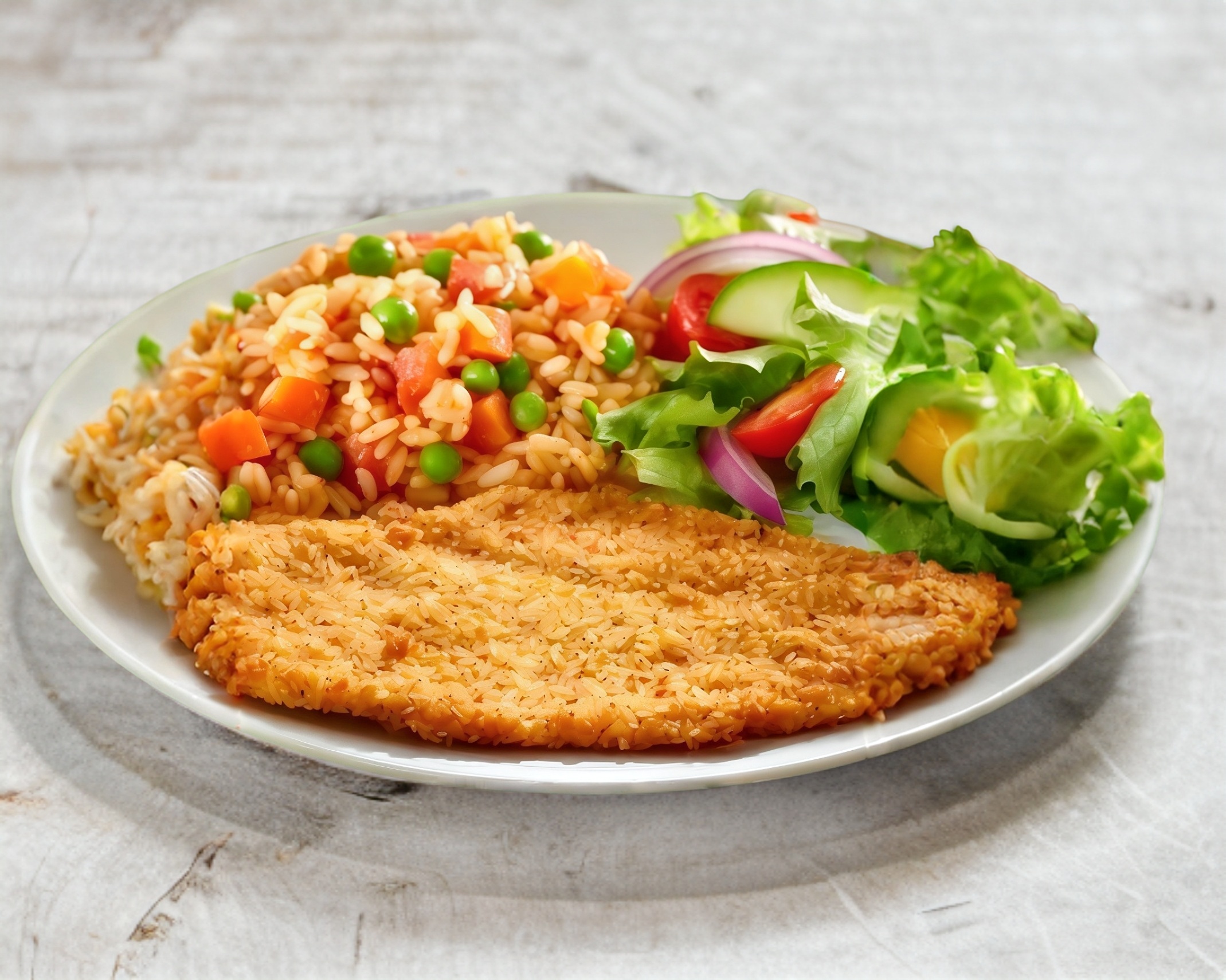 Milanesa de pollo empanizada, acompañada de ensalada de lechuga, jitomate y aguacate, con arroz, frijoles guisados, salsa picante y tortillas.