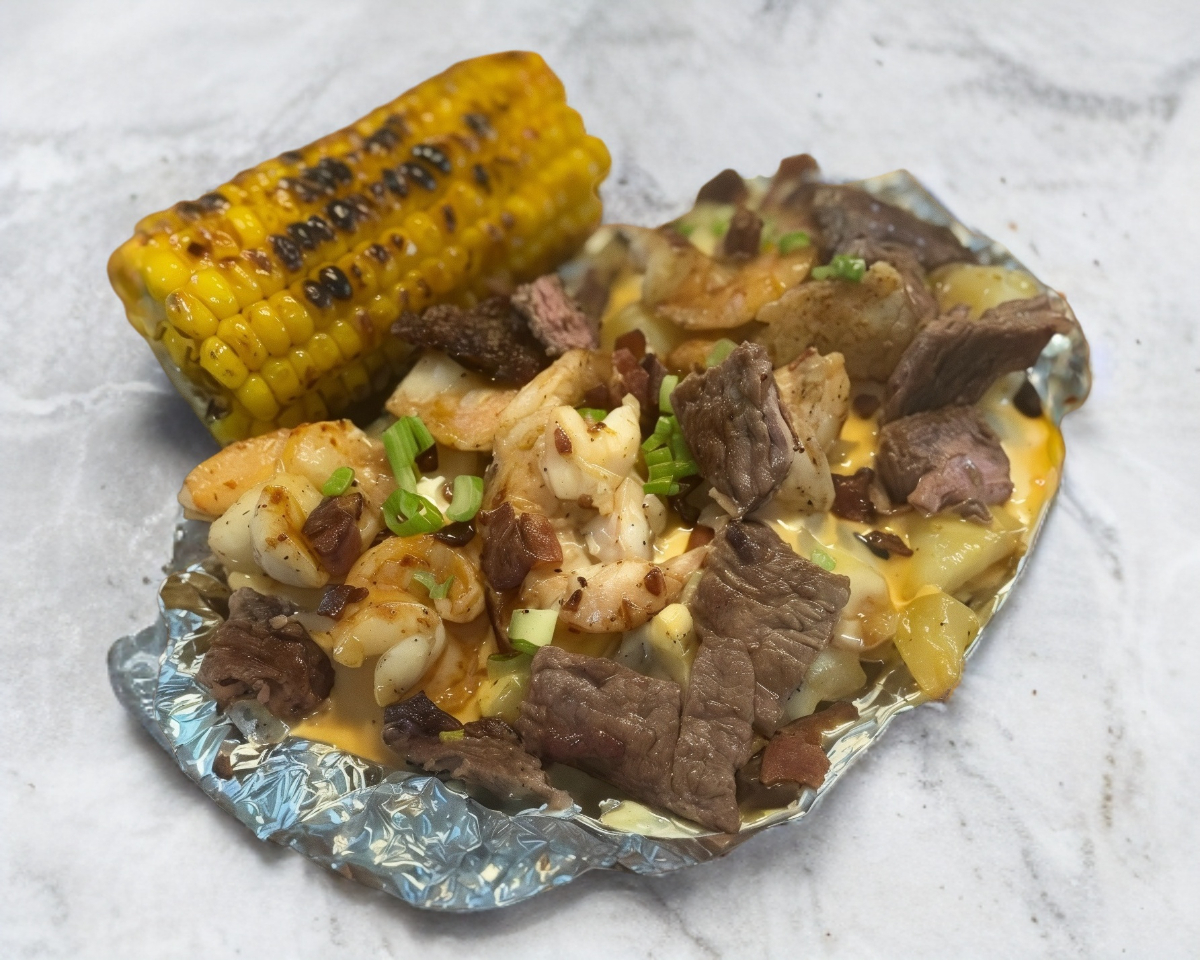 Taco relleno de arrachera, camarón y guacamole.