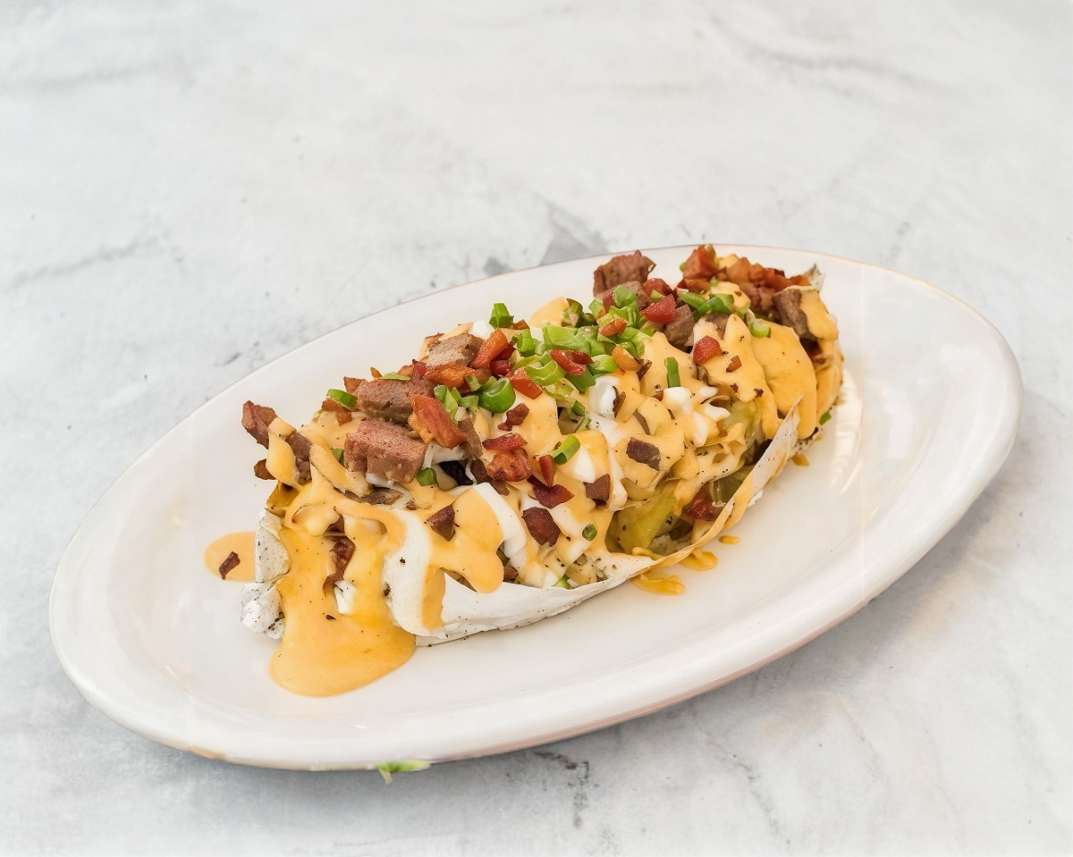 Papa horneada (200g), rellena de arrachera sazonada, con aderezos coronada con tocino y cebollín.