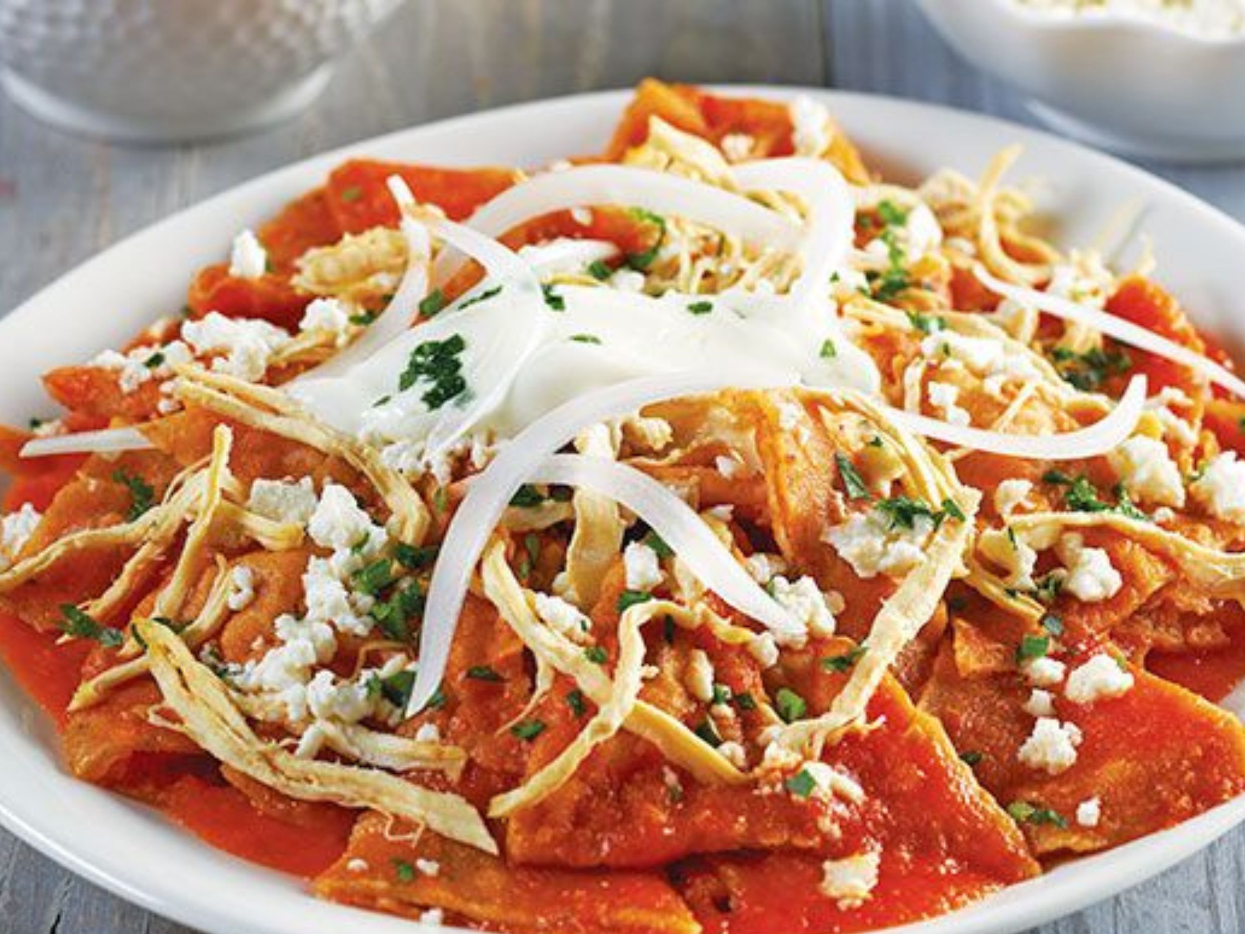 Totopos bañados en salsa roja, queso, crema, cebolla y aguacate. Acompañado de frijoles refritos.