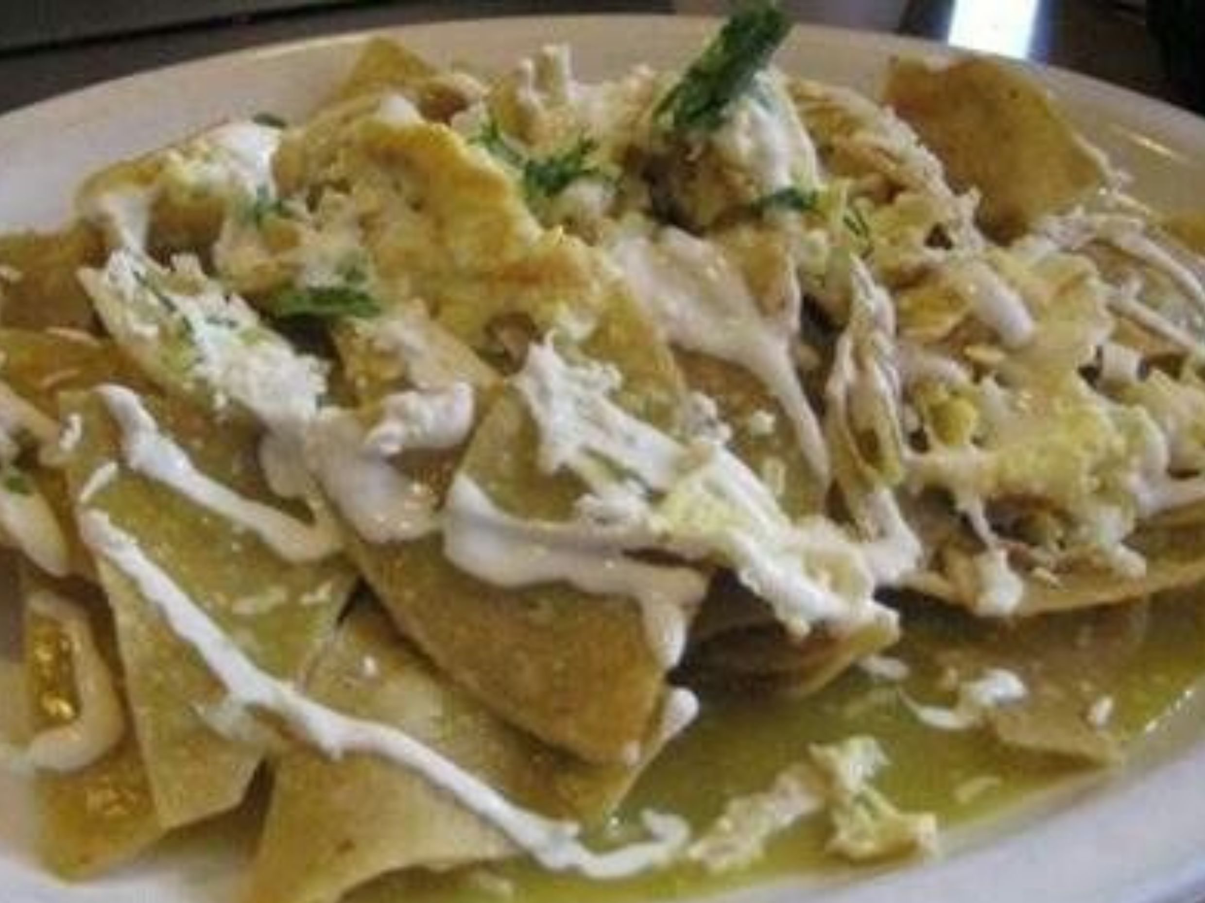 Totopos bañados en salsa verde, queso, crema, cebolla y aguacate. Acompañado de frijoles refritos.
