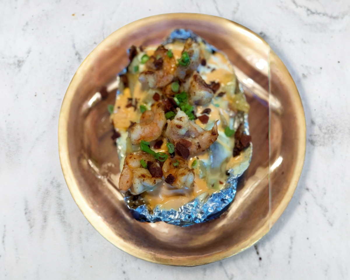 Papa horneada con camarones frescos y especias.