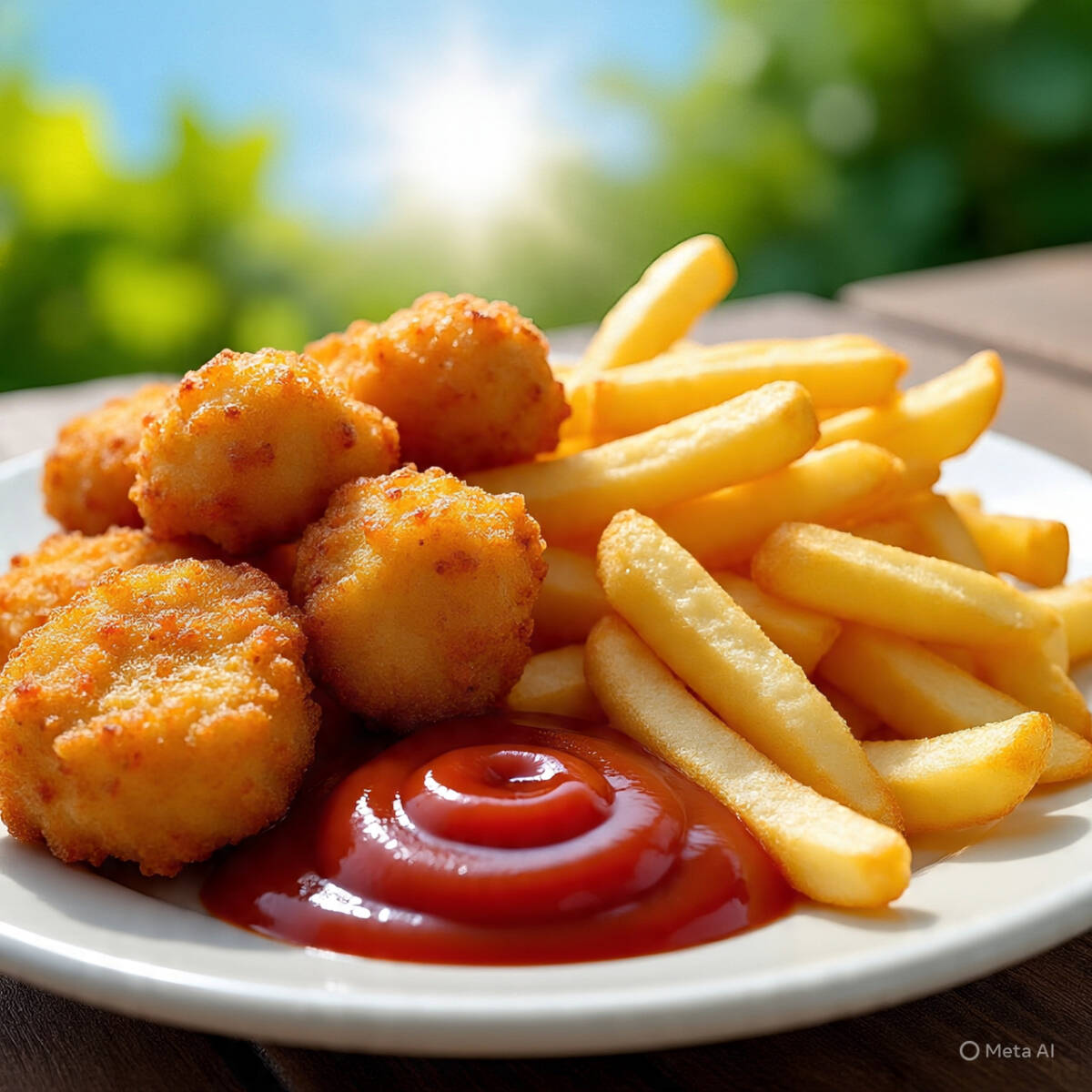 Nuggets de pollo con papas a la francesa y catsup.