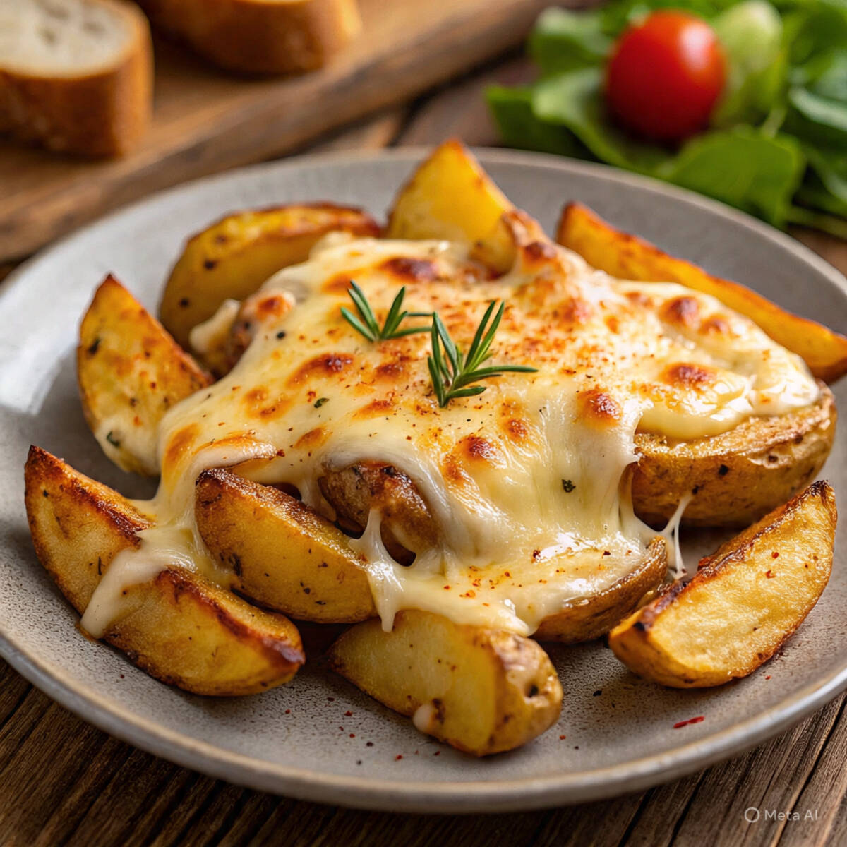 Papas en gajos acompañadas de queso chedar.