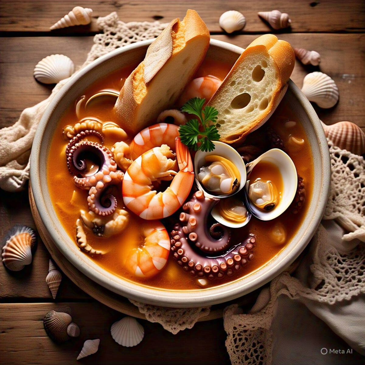 Sopa con camarones, pulpo y almeja.