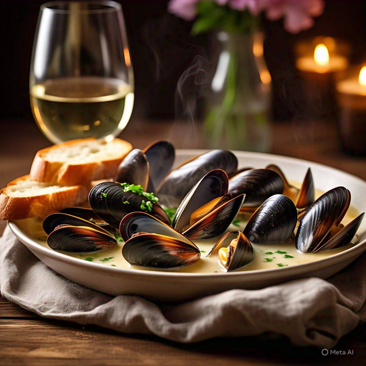 Mejillones bañados en vino blanco con aderezado perejil y ajo.