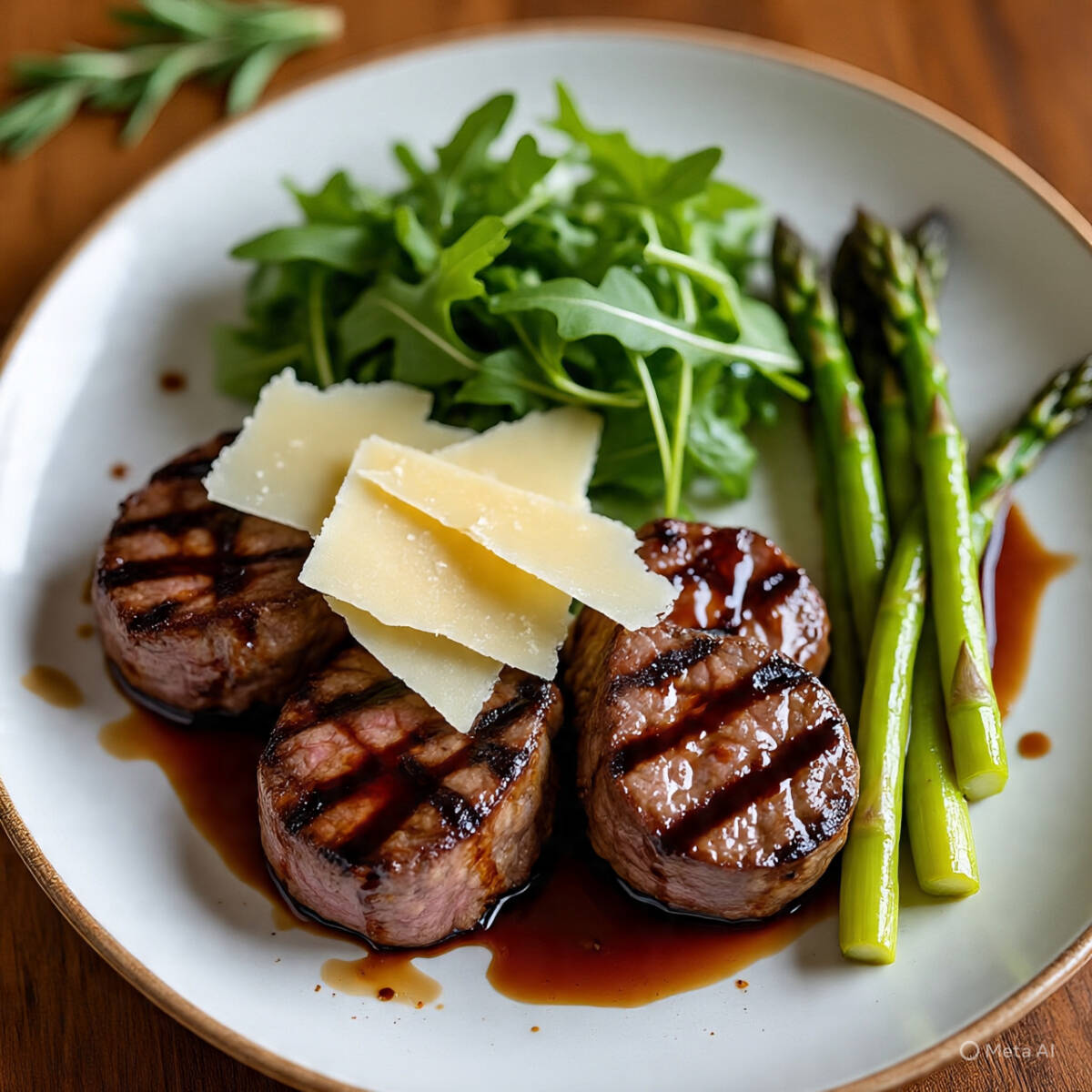Medallones de res a la parrilla con ensalada de arúgula, queso parmesano, reducción de balsámico y espárragos salteados.