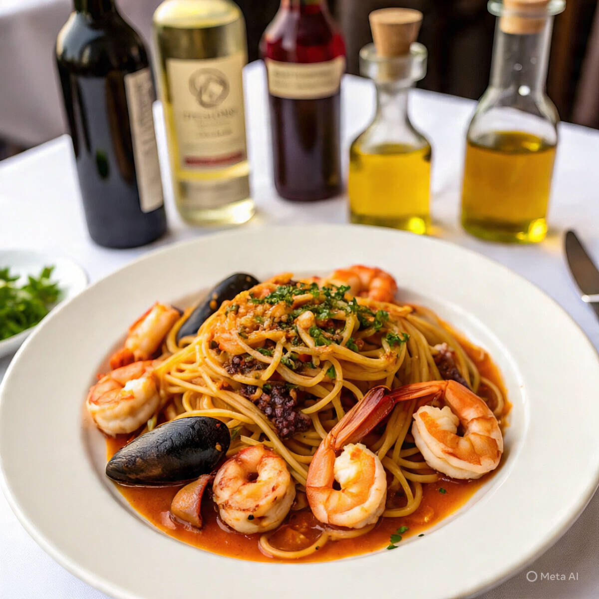 Pasta al ajo con aceite de olivo, pimiento triturado, perejil y bañado en vino blanco.