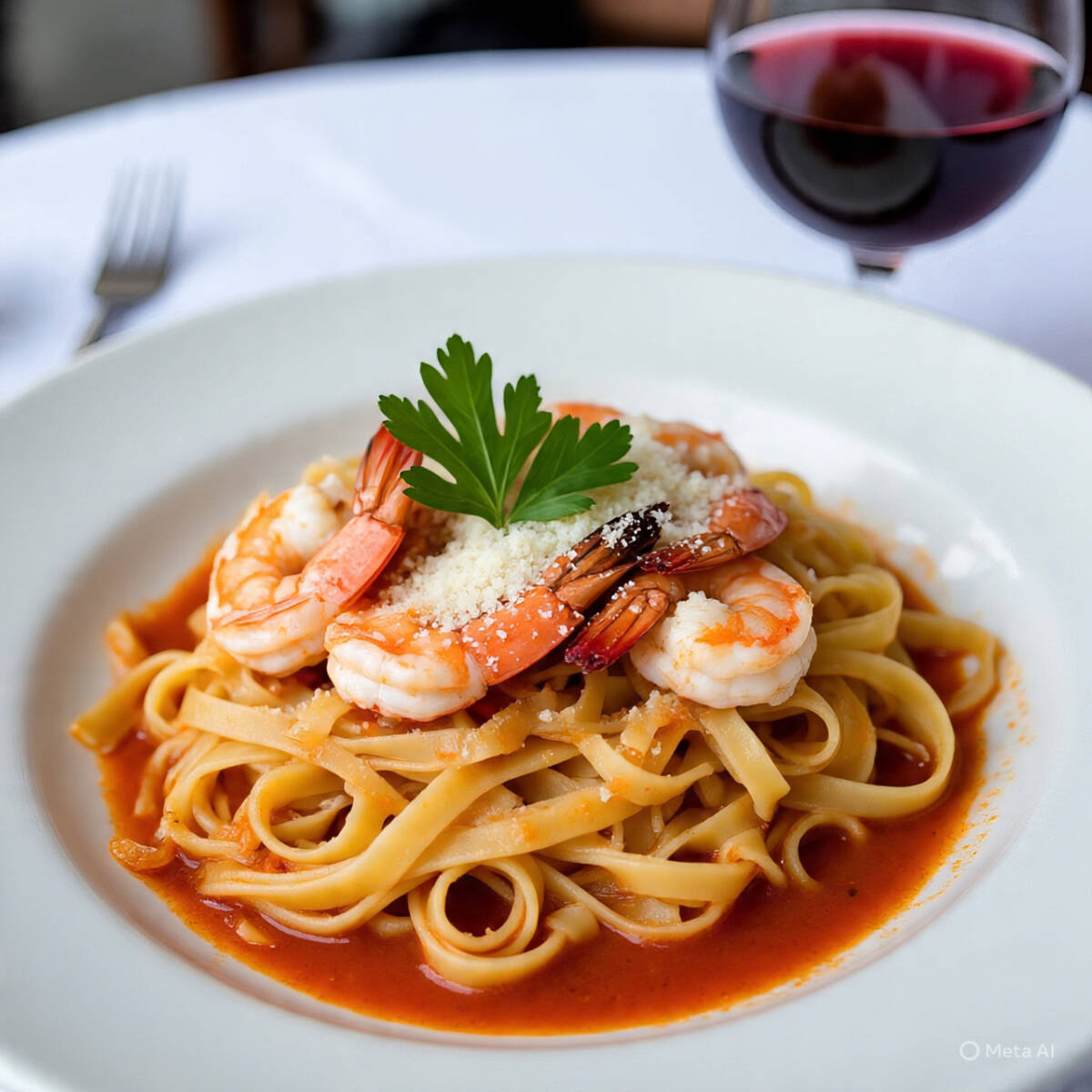 Pasta con camarones flameados en brandy y salsa de jitomate.