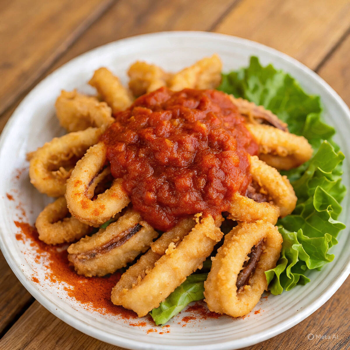 Calamares con cama de lechuga y salsa marinera.