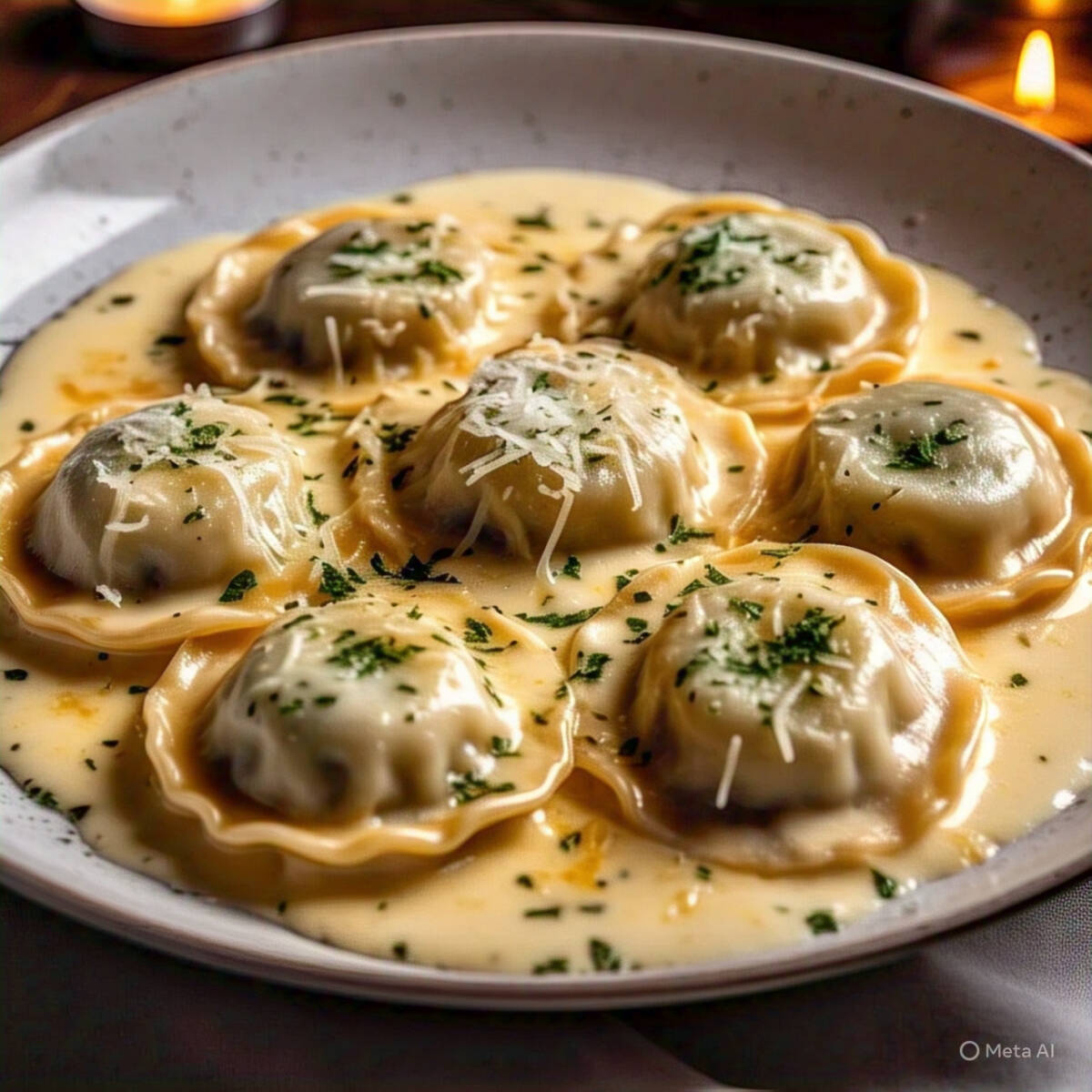 Pasta rellena de queso ricotta y espinacas en salsa cremosa con cuatro quesos.